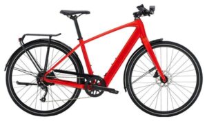Vélo de ville électrique Trek FX+ 2, cadre léger, transmission Shimano Altus 9 vitesses, batterie 250 Wh, roues 700 mm, coloris rouge dynamique.