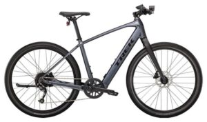 Vélo de fitness électrique Trek Dual Sport+ 2 avec transmission Shimano Altus 9V, batterie 250 Wh et roues 650 mm. Coloris gris.