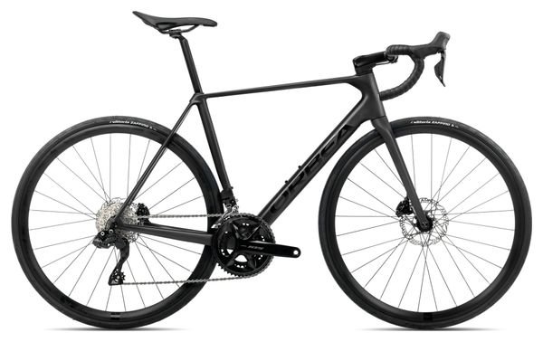 Vélo de route Orbea Orca M30i 2025, équipé du groupe électronique Shimano 105 Di2 12 vitesses, roues 700 mm et cadre au design gris noir Vulcano.