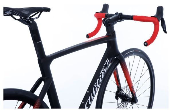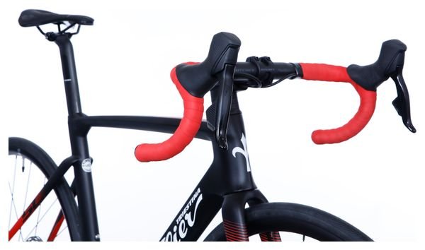 Alliant aérodynamisme et transmission électronique sans fil, le Wilier Triestina Cento10 SL 2024 en Noir et Rouge est équipé du groupe SRAM Rival eTap AXS 12 vitesses et de roues 700 mm pour une performance fluide et moderne sur la route.