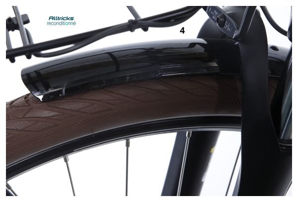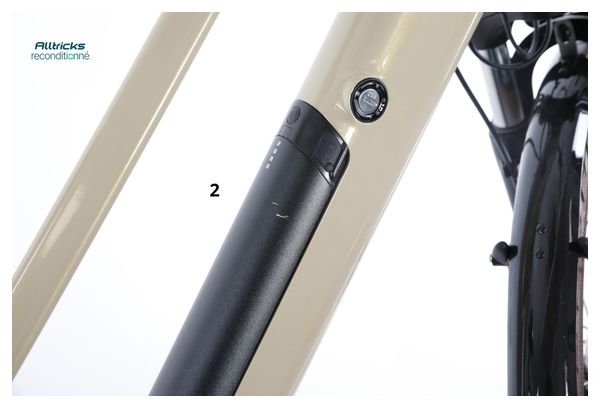 Découvrez le vélo de ville électrique reconditionné Bicyklet Camille, équipé d’une transmission Shimano Acera/Altus 8 vitesses, d’une batterie 504 Wh, de roues 700 mm et d’une élégante finition beige ivoire.