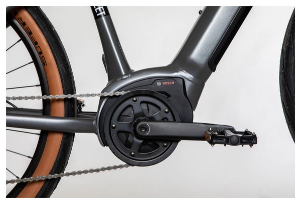 Vélo Fitness Électrique Bicyklet Gabriel Gris Titane, doté d’une transmission Shimano Altus 9 vitesses et d’une batterie 500 Wh pour un pédalage dynamique au quotidien.