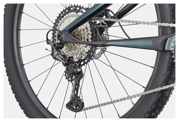 VTT Tout-Suspendu Cannondale Scalpel 3 Carbon 29” Gris/Vert, équipé d’une transmission Shimano Deore/XT 12 vitesses pour performance et légèreté sur tous les terrains.